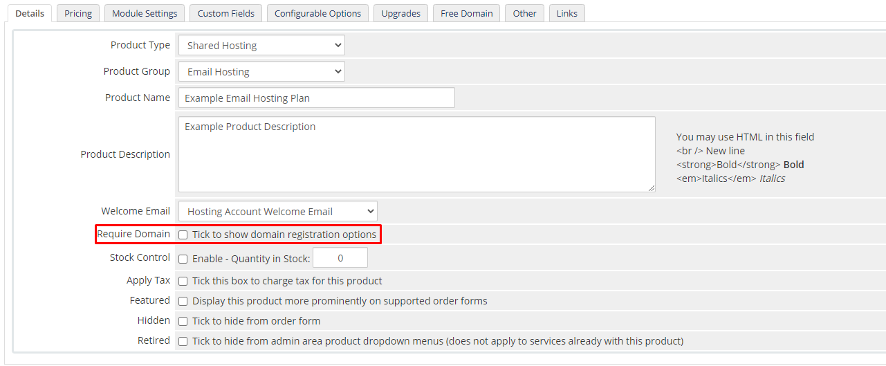 - Unlike our shared hosting products, this particular product does not require a domain name. Please ensure this option is unticked in the 'Details' tab when configuring email hosting products.