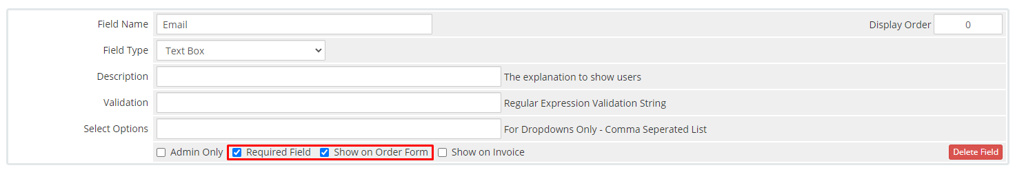 - When configuring the custom fields for email hosting products, you will need to ensure you have selected 'Required Field' and 'Showe on Order Form' for the following custom fields: