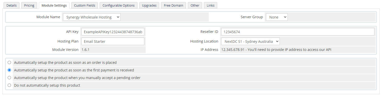 - Automatically setup the product as soon as the first payment is received — Perform the setup as soon as the customer pays for the order.