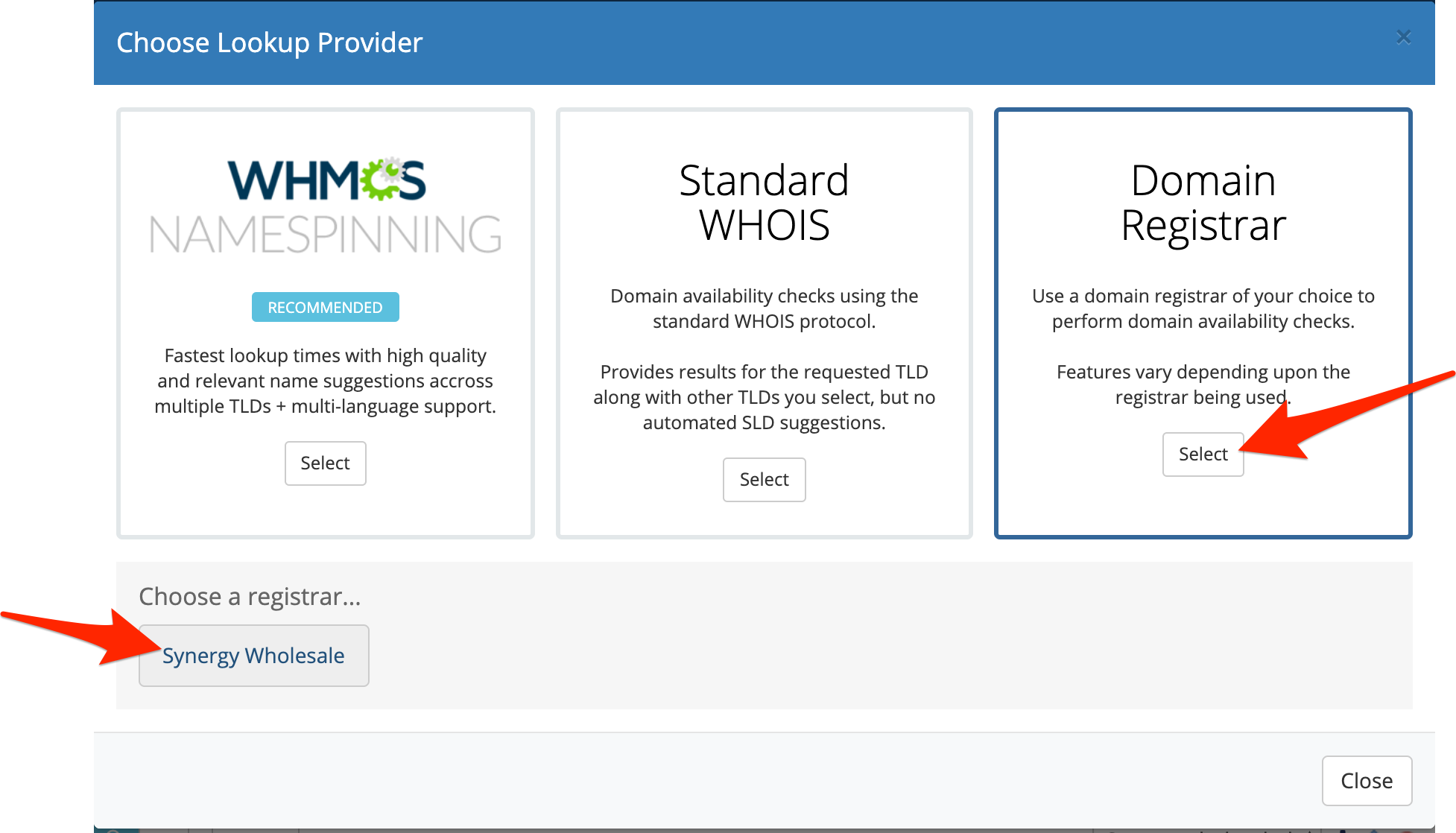 Now you will be presented with a "Choose Lookup Provider" popup. First select "Domain Registrar" and then select "Synergy Wholesale".