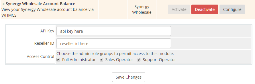 Once the module's files have been placed in the directories specified above, you can setup the module in WHMCS by navigating to: Hover over the Settings icon (spanner icon) at the top right of WHMCS >> System Settings >> Click on Addon Modules Once there, click "Activate" on the "Synergy Wholesale Account Balance" module. Then click "Configure" and fill in the required details.