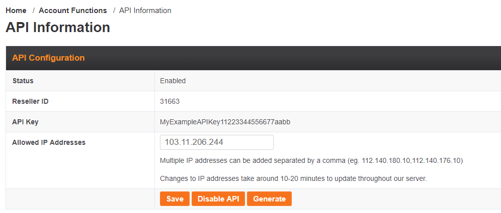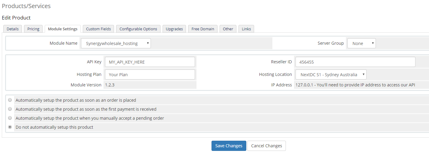 From here you can retrieve your API key and reseller ID along with providing the IP address of the server where WHMCS is installed. Some examples are provided below of the Product module settings tab along with our API Information page.