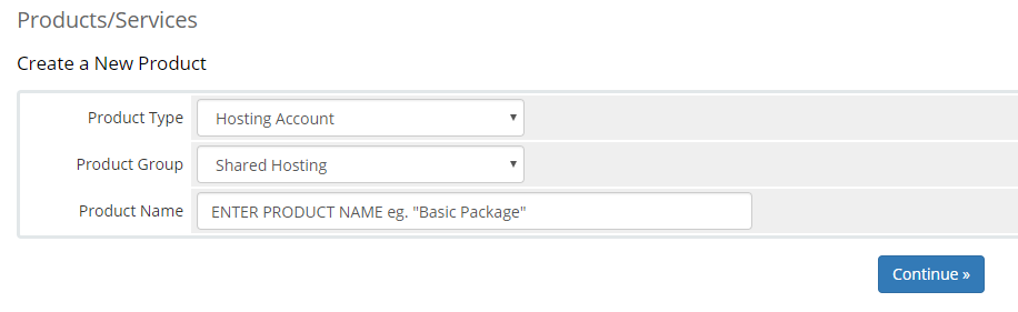 Once that has been done you can head into Create a New Product and select the Product Type as Hosting Account and then choose the Product Group we setup earlier before giving this product a name then continue as shown below.