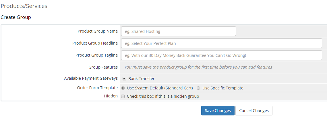 To create a NEW group and product using our module Choose the option to create a new group, name and describe it appropriately and configure it to use desired payment gateways that have been configured.
