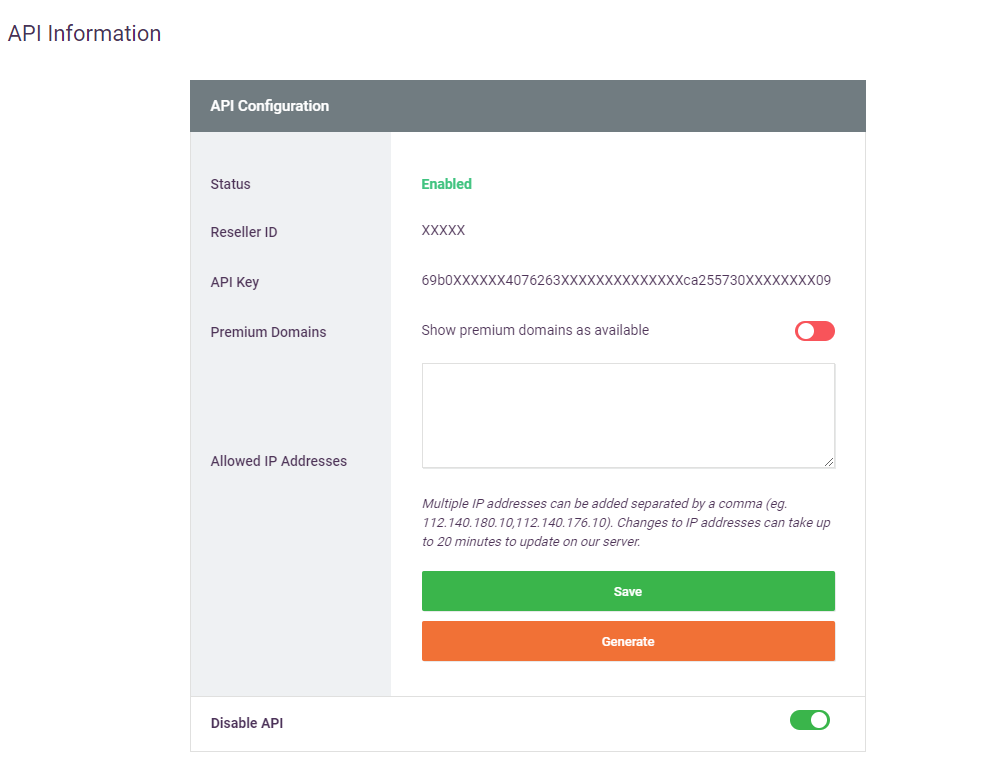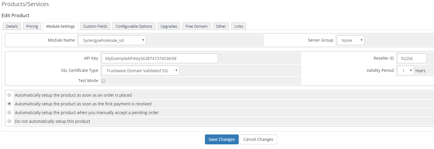 From here you can retrieve your API key and reseller ID along with providing the IP address of the server where WHMCS is installed. Some examples are provided below of the Product module settings tab along with our API Information page.
