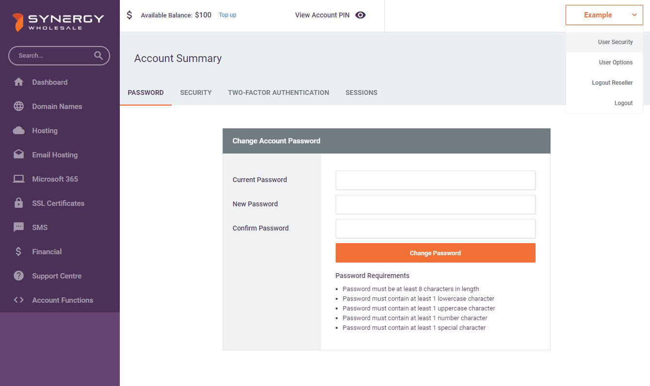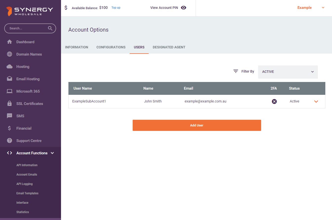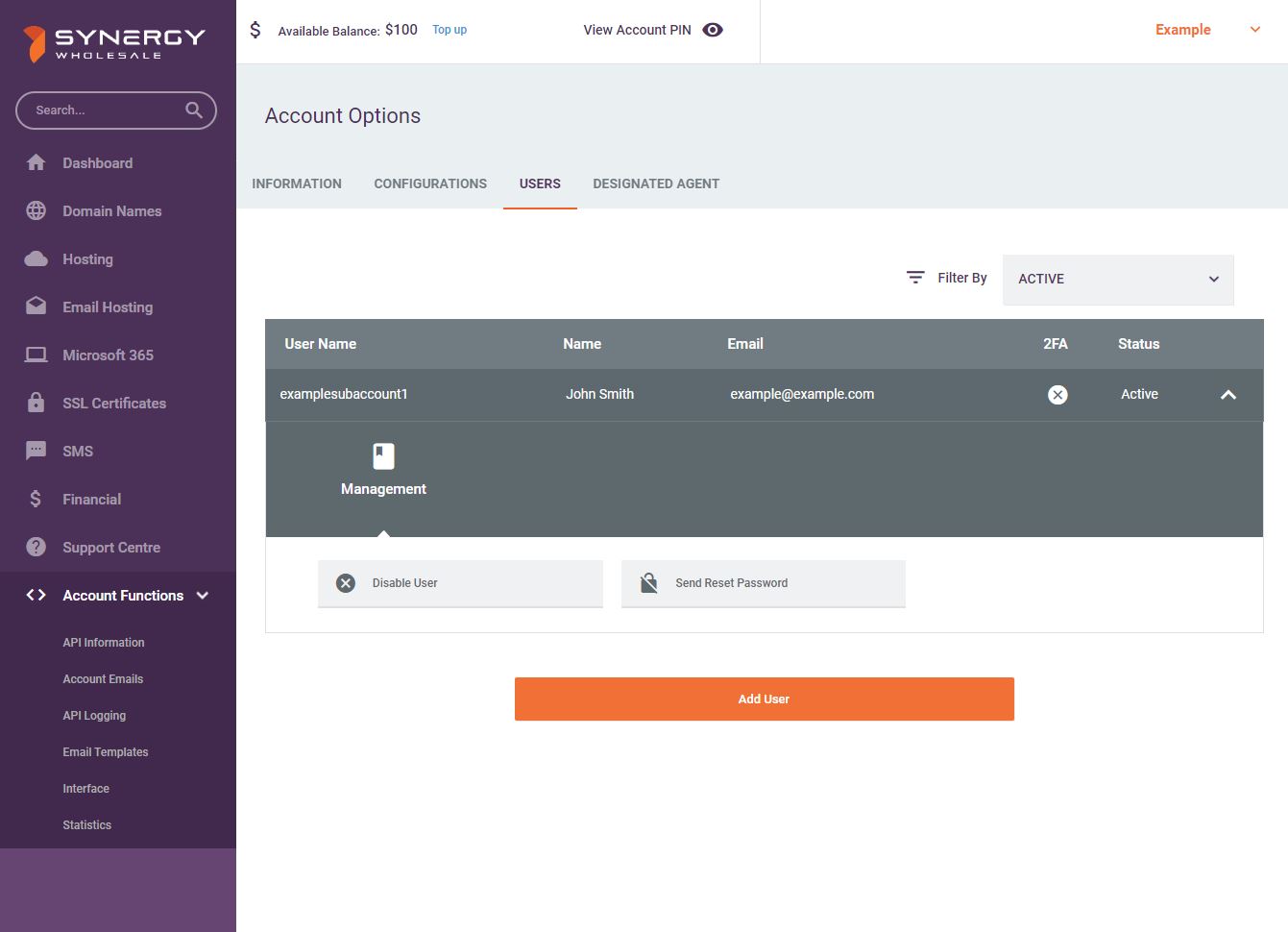 Aside from exporting and the above settings, Additional Users should be treated the same as providing admin access to your Synergy Wholesale Management System. New users will have access to all other Synergy Wholesale Management System features including the ability to manage and create services as well as top-ups and financial settings.