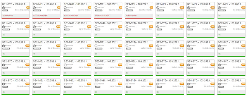 IP addresses that are currently listed (shown in red) are not in use and will remain inactive until de-listing has been completed. This proves that sending email to virtually any email provider in the world will not have an issue from Synergy Wholesale hosting servers.