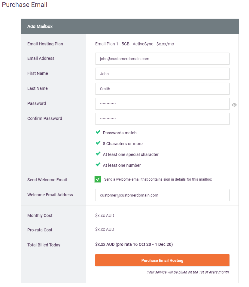 - Fill out the required details and finalise the creation of your account by selecting Purchase Email Hosting