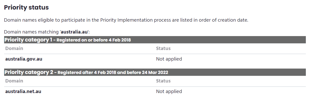 This outlines that the registrant for ‘australia.gov.au‘ is considered a ‘Priority Category 1‘ and has not yet taken any action to apply or decline.