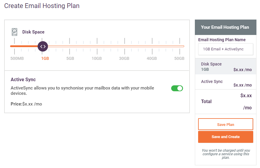 - Click Create New Email Hosting Plan to instead create a new, separate plan that includes ActiveSync.