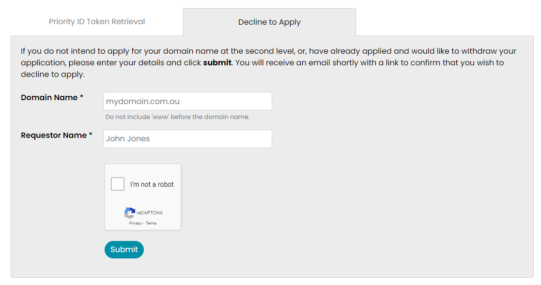 This is all done from an auDA website (https://priority.auda.org.au) Here, applications can be made to retrieve the Priority ID Token, or you can withdraw your priority application status from a single domain allocated for contested .au direct domain names.